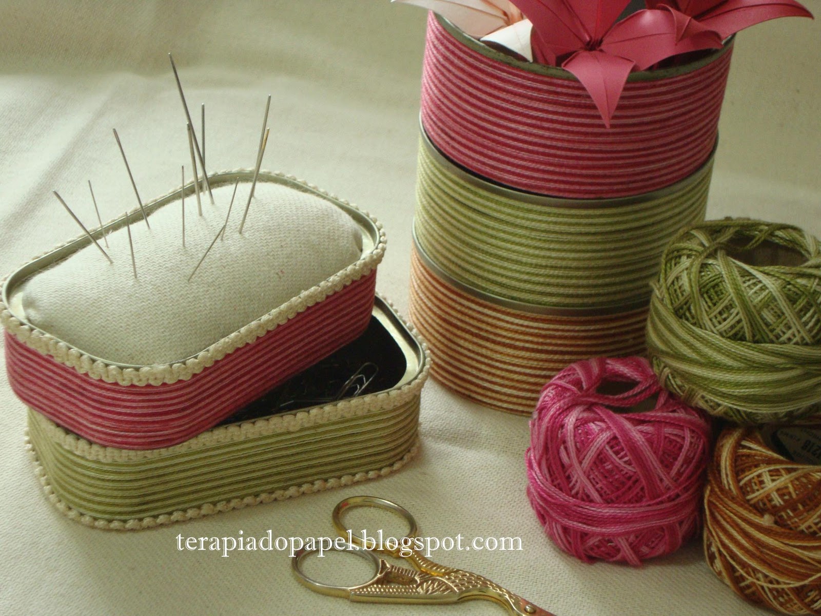 Me empolguei e fiz agulheiro com latas de sardinha e atum, com direito a compartimento para tesoura e clips, materiais que uso na confecção dos móbiles.