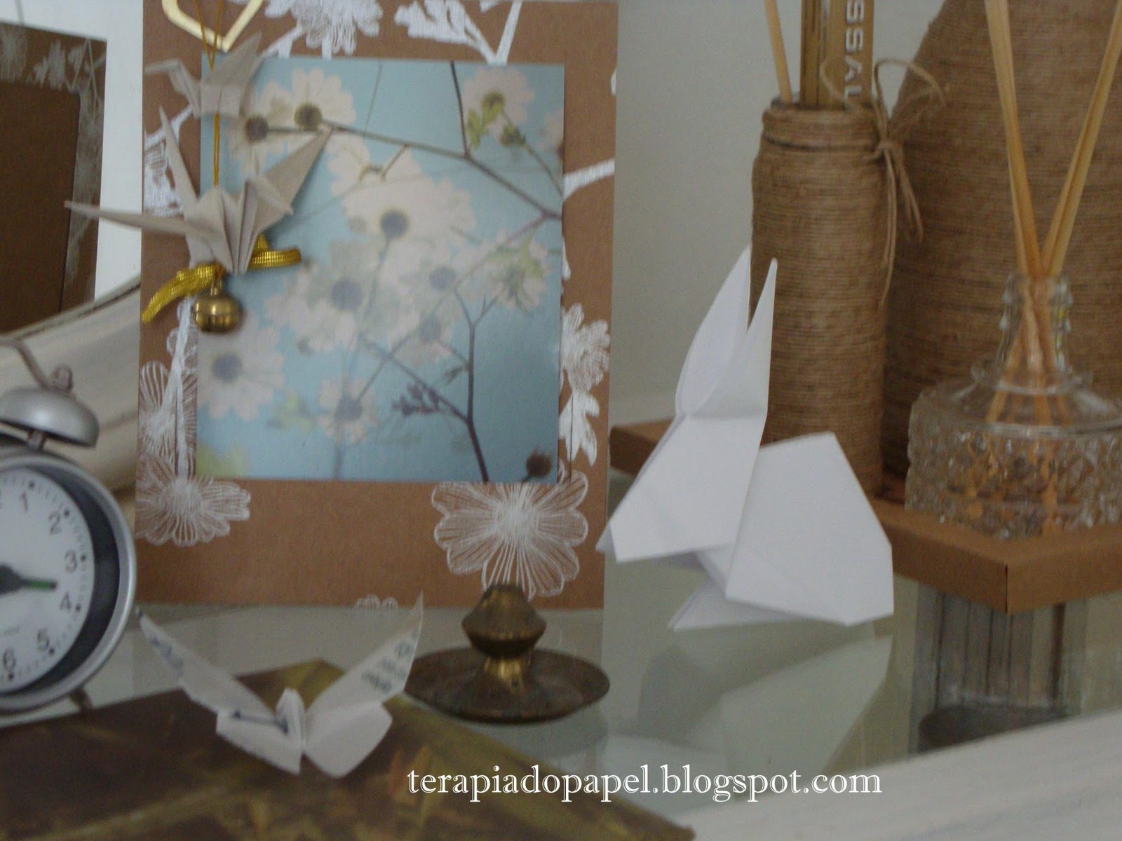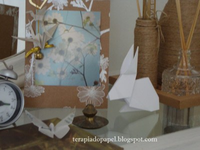 O cartão em si, feito de papel vegetal já virou borboleta, e o porta retrato que ganhou um Tsuru, já está enfeitando e perfumando meu atelier.