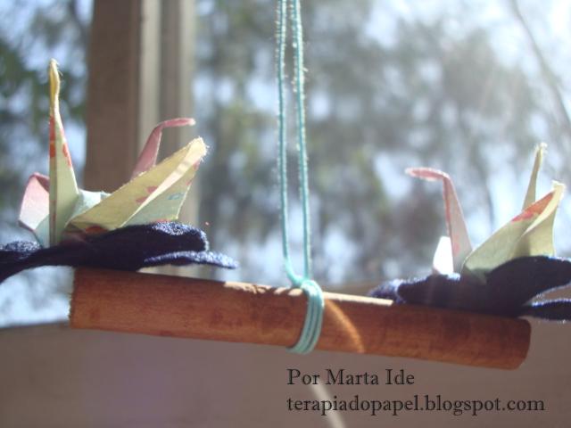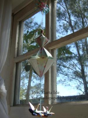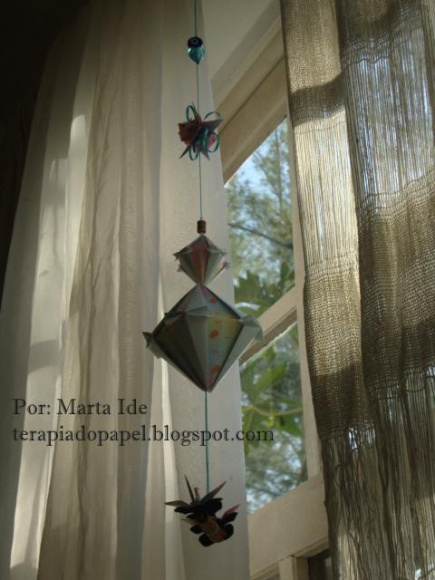 Um lindo móbile de kusudama de autoria da Tomoko Fuse, já devidamente instalado, faz companhia para o da Ivani, espalhando boas energias pelo ambiente.