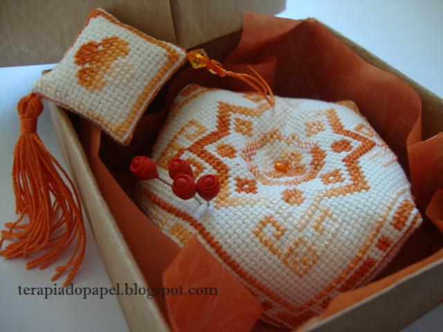 Com tanto carinho recebido, tentei lhe retribuir e junto com mais algumas coisinhas foi um Biscornu bordado em ponto cruz…