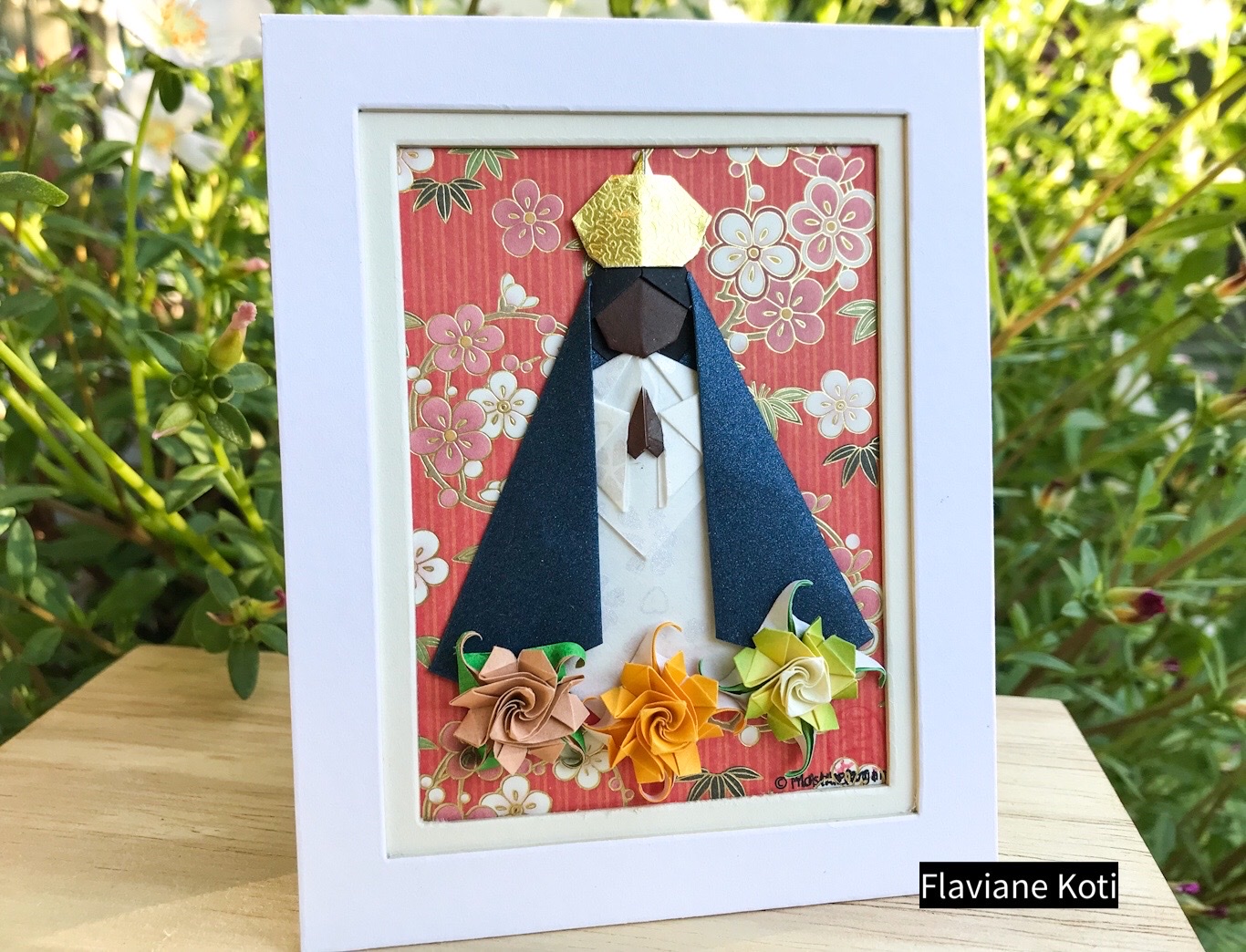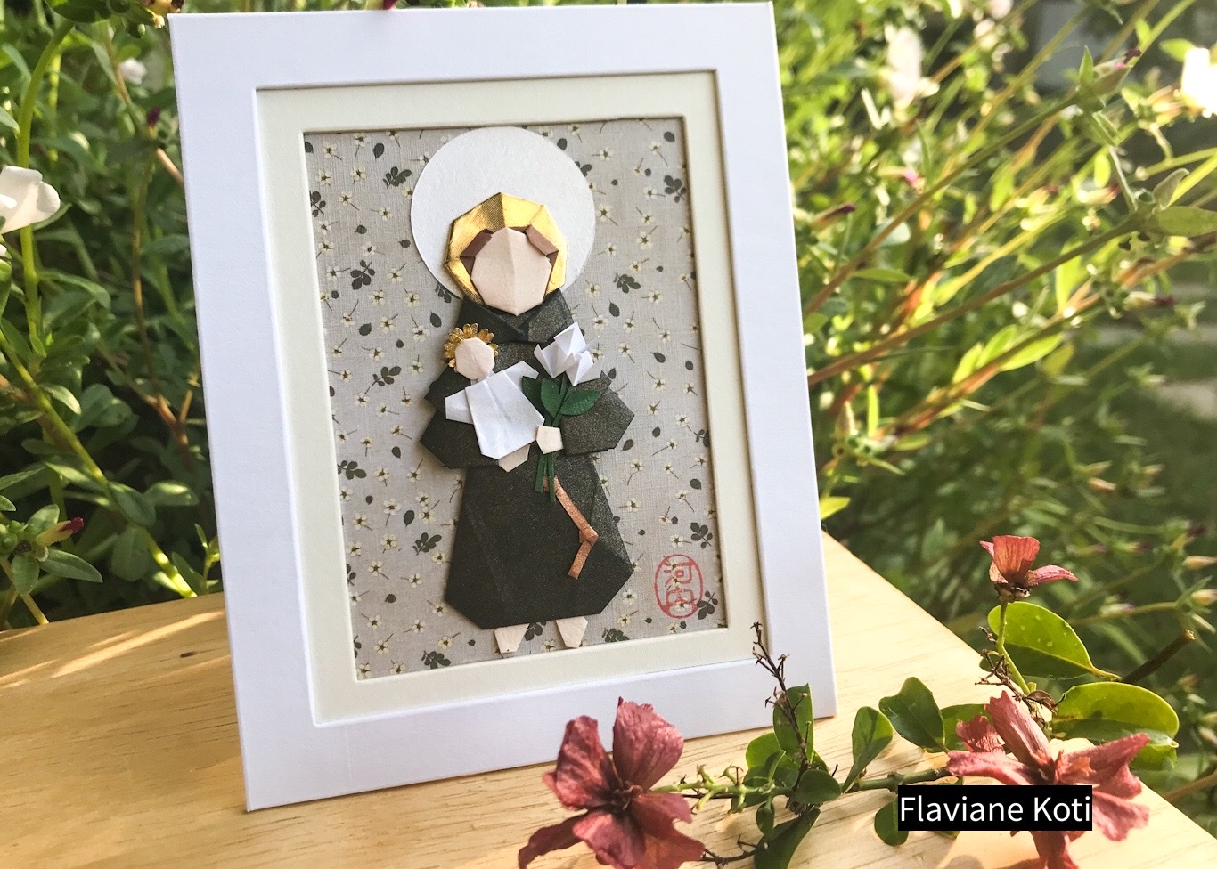 A fé dobrada nos quadrinhos de Santos Católicos, de Origami. Com borda em paspatur duplo, imantado com calendário 2020. Tamanho de 13 x 11cm aproximadamente. *Pode ser emoldurado como quadro.